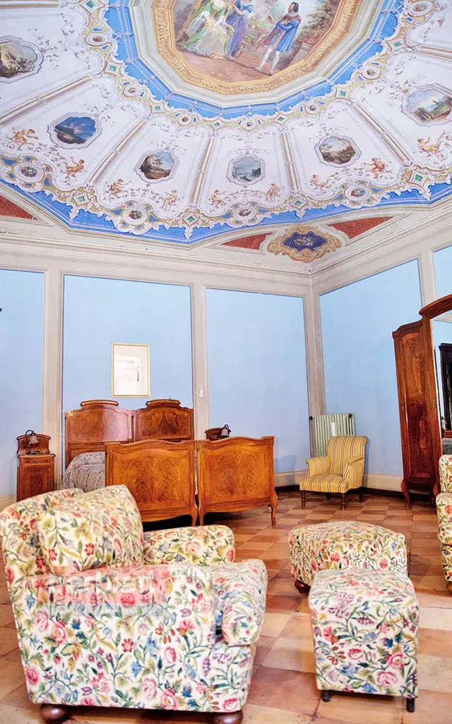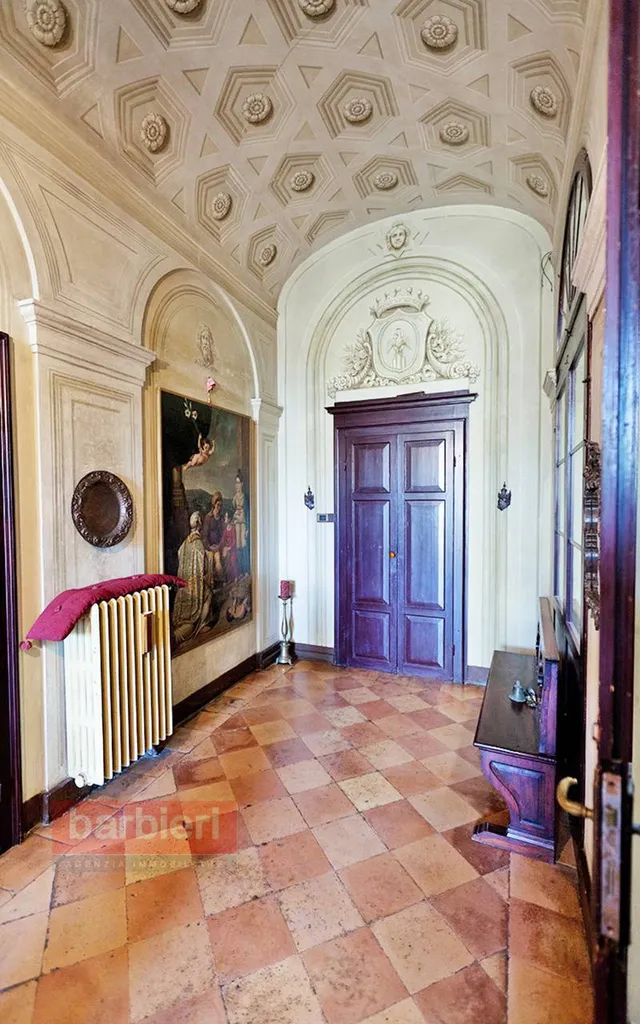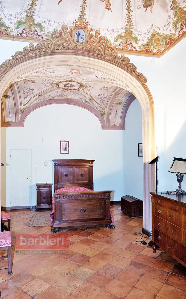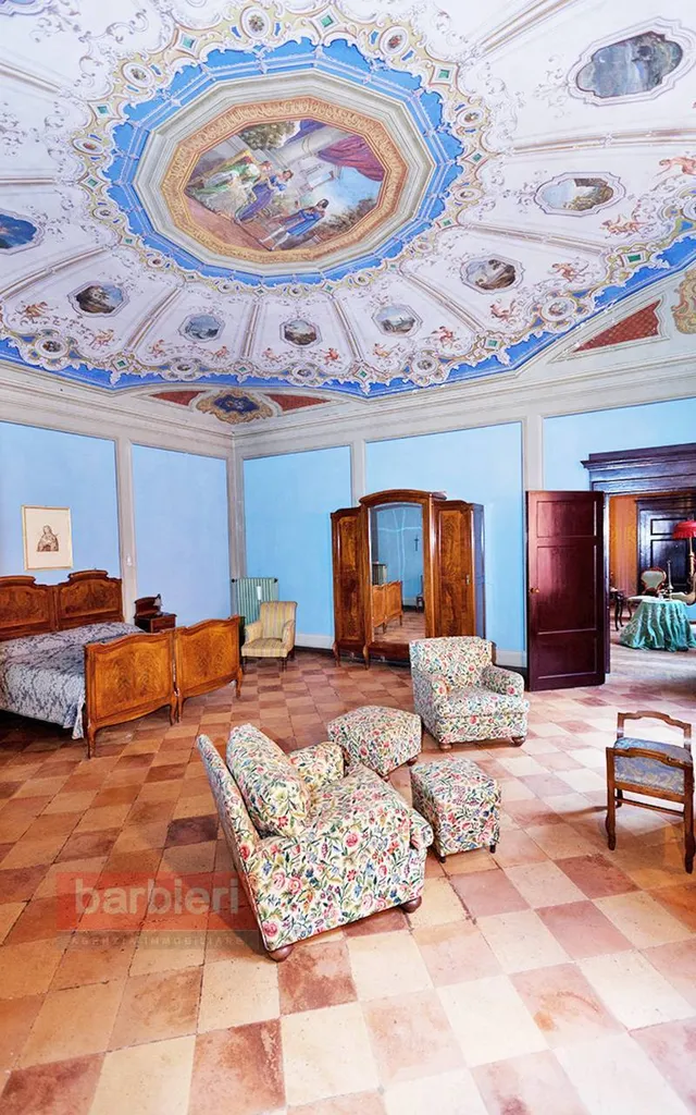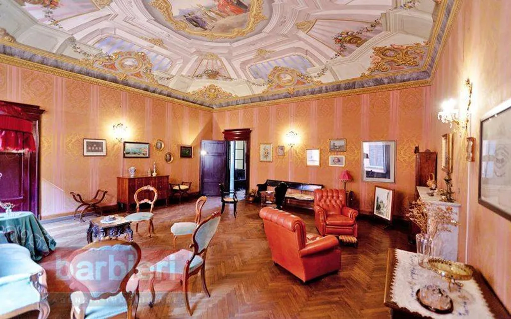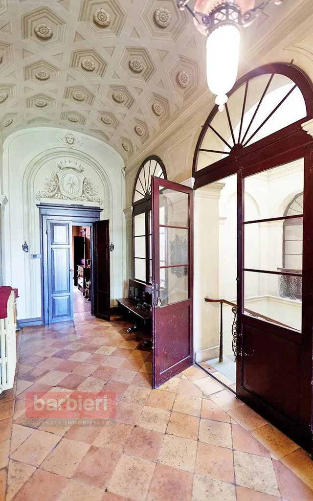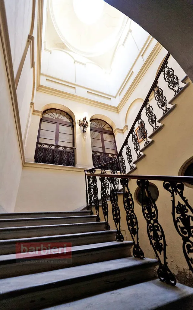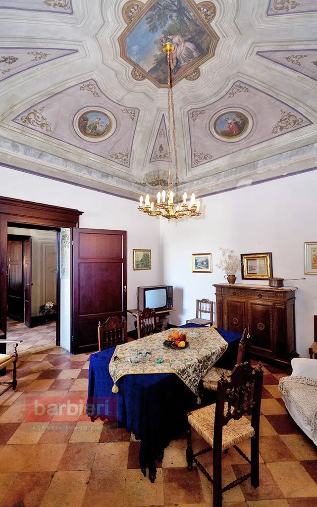 Tramite scala interna si accede all'appartamento nobile e alla terza unità abitativa. L'appartamento principale è composto da soggiorno, sala da pranzo, cucina separata, disimpegno, tre camere da letto, bagno, disimpegno e un'ulteriore locale adibito a studio. Ogni ambiente è impreziosito da soffitti e pareti decorati ad arte, intarsi e fregi. In uscita dalla sala da pranzo, dal disimpegno e dallo studio troviamo uno splendido terrazzo loggiato con vista sul giardino privato.
